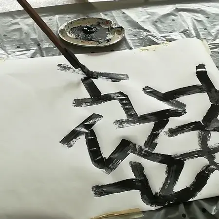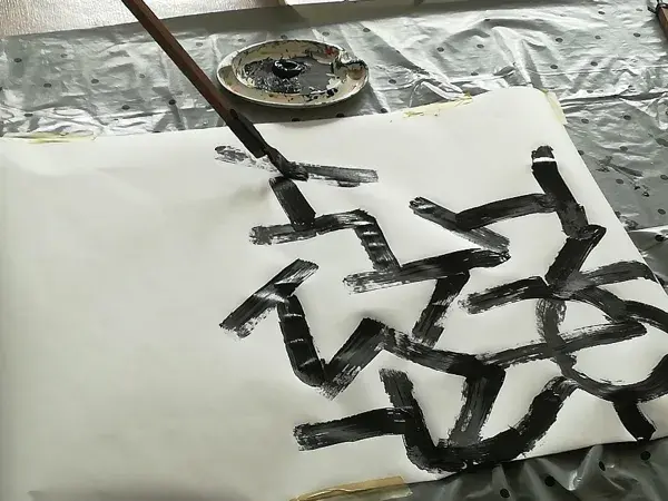 En utilisant des outils fabriqués et en peignant au sol, chacun est invité à explorer la relation entre outil, mouvement et matière.