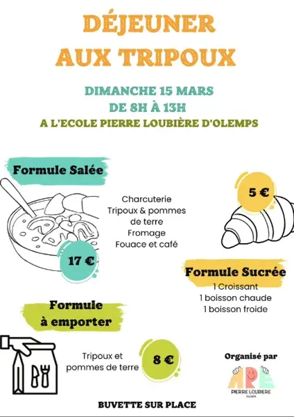 L'APE de l'école Pierre Loubière d'Olemps vous propose le dimanche 15 mars de 8h à 13h un petit déjeuner.