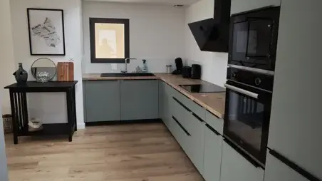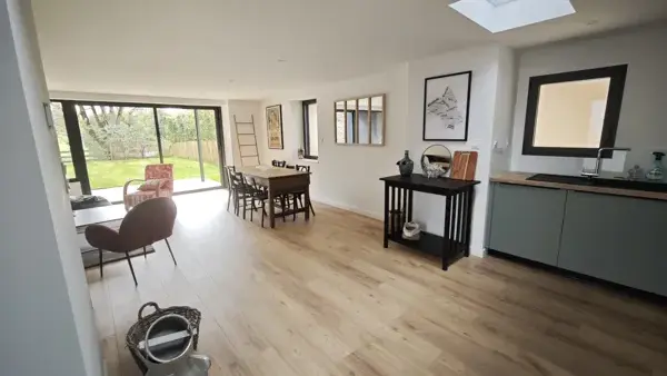 D'une cuisine équipée ouverte sur le séjour et l'espace repas.