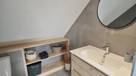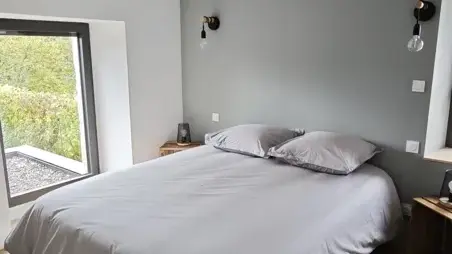 Cette maison est composée de deux chambres avec salle de bain et d'un espace télé avec un canapé lit.