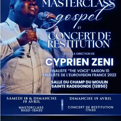 Finaliste de The Voice saison 10 de l'Eurovision 2022, Cyprien ZENI vous propose un Masterclass gospel et concert de restitution. La masterclass est de samedi à dimanche de 09h30 à 16h30 et l'entré est à 60 euro et le dimanche gratuit à partir de 17h30.