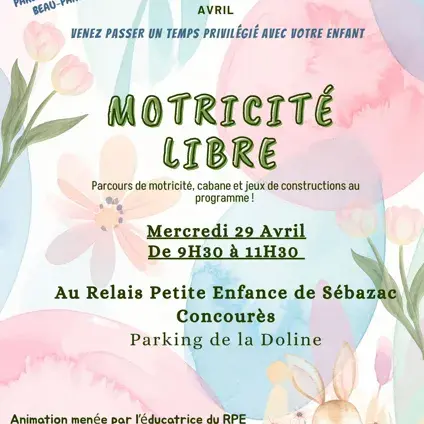 Le Relais Petite Enfance de Sébazac-Concourès vous propose une matinée dédiée à la motricité libre, spécialement pensée pour les enfants de 0 à 5 ans. Dans un cadre sécurisant et bienveillant, les tout-petits pourront découvrir un parcours de motricité, construire des cabanes et expérimenter différents jeux favorisant leur développement.
