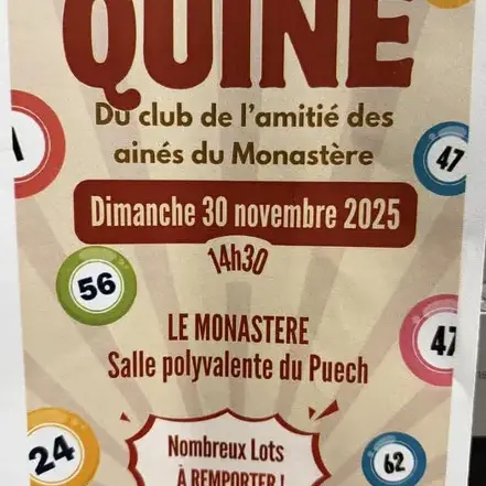 Le dimanche 30 novembre c’est le retour du traditionnel QUINE du Club de l’Amitié des Aînés du Monastère ! À 14h30, nombreux lots à remporter !