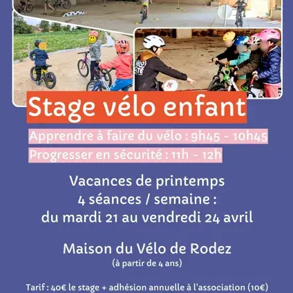 Les séances durent 1h et se déroulent aux anciens haras de Rodez. En cas de mauvaise météo, les séances sont maintenus car nous avons accès à un préau couvert. Elles sont encadrées par un.e moniteur.rice vélo professionnel.le. Les enfants utilisent leur vélo et leur casque mais l’association peut les fournir sur demande.
